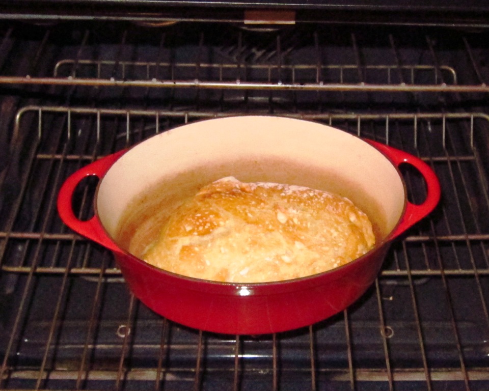 Two hours into the rising time, turn on the oven to 450 degrees, and place your baking dish inside. The recipe recommends a large, heavy casserole or Dutch oven with a lid. I have a cast-iron enamel Dutch oven I use.